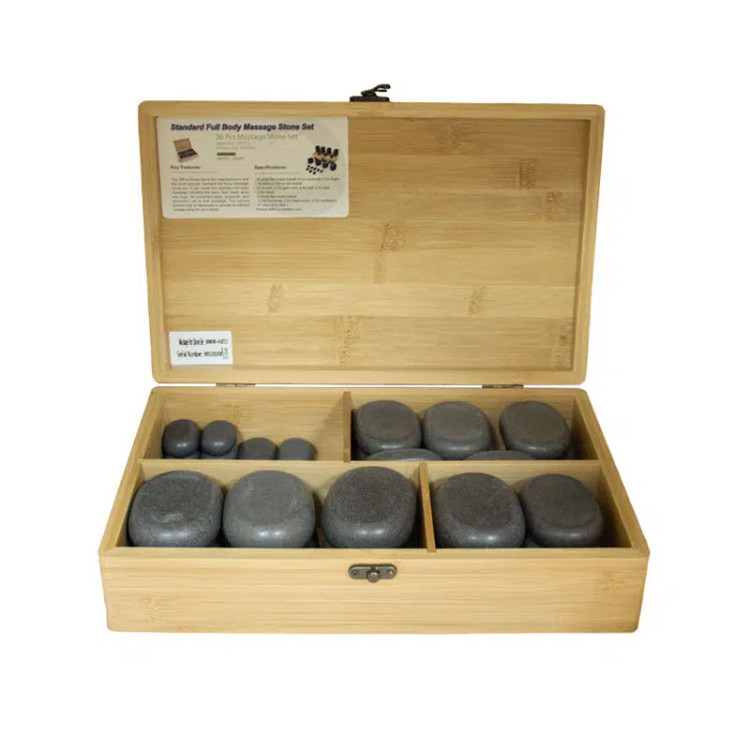 ست سنگ ماساژ ریلکس Relax H36TC که از نوع سنگ های بازالت می باشد و در تعداد 36 قطعه سنگ در ابعاد بزرگ، متوسط، کوچک با اشکال بیضی مانند هستند و برای قسمت های مختلف بدن شامل: کمر، پشت، ران ها، گردن، پاها، کف دست و پا، چاکرا و انگشتان موجود دارد که می توان با روغن و یا بدون روغن استفاده کرد. بهتر است این سنگ ها به علت صدمه ندیدن پوست تا درجه حرارت مشخصی تا حدود 50 درجه گرم شود. ست سنگ ماساژ ریلکس Relax H36TC مجموعه کاملی برای رفع نیاز های مصرف کنندگان ایجاد می کند. همچنین دارای جعبه بامبو برای قرار گرفتن سنگ ها نیز می باشد.